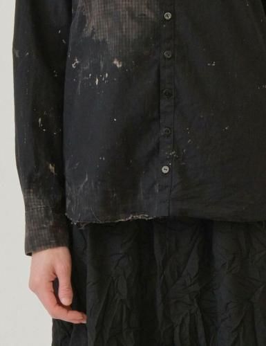 浮き出るチェック柄は元のはっきりした柄ではなく、脱色剤でチェック柄自体もフェードされて程よい抜け感と、曖昧さをたたえたフェード感ある表情に仕上がっている。