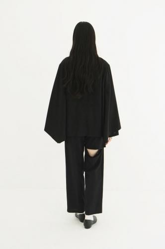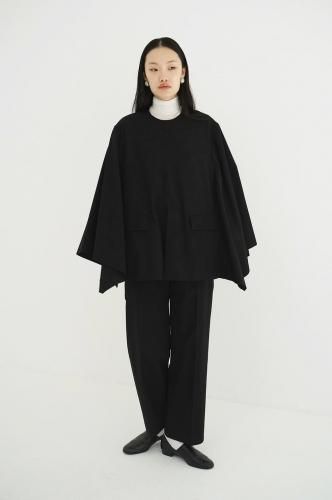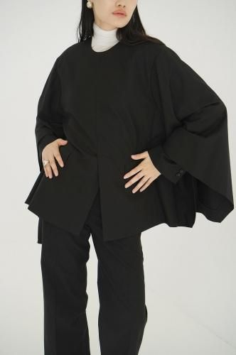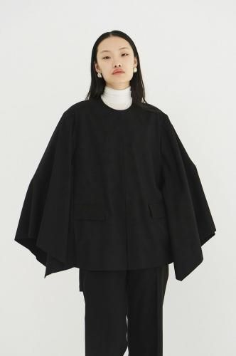 ワイドなシルエットが上品でモードな印象を与え、フォーマルな場面でも活躍する一着です。ケープの中にはポケットと内袖が付いており、袖口をロールアップした着こなしもおすすめです。ややドロップショルダー気味のシルエットで、インナーに厚手のニットを合わせても窮屈感なく着用いただけます。