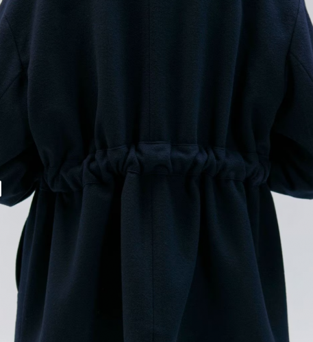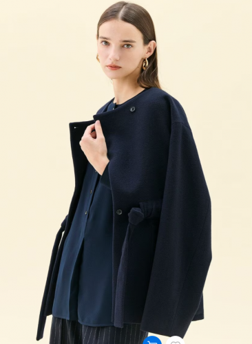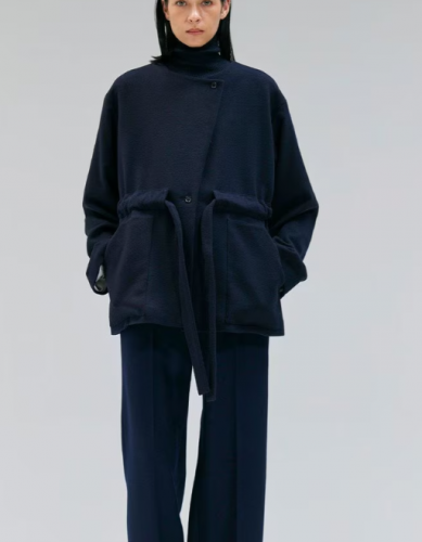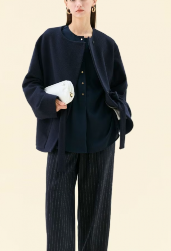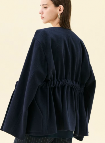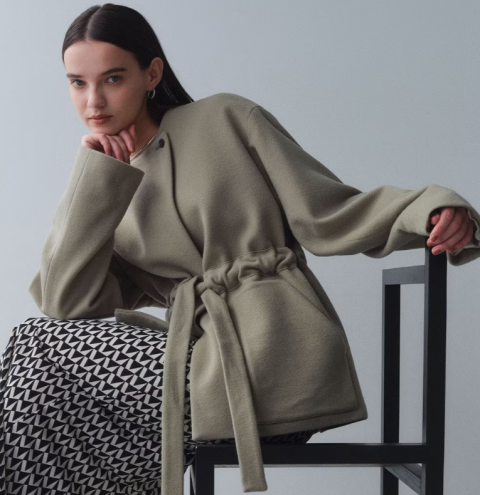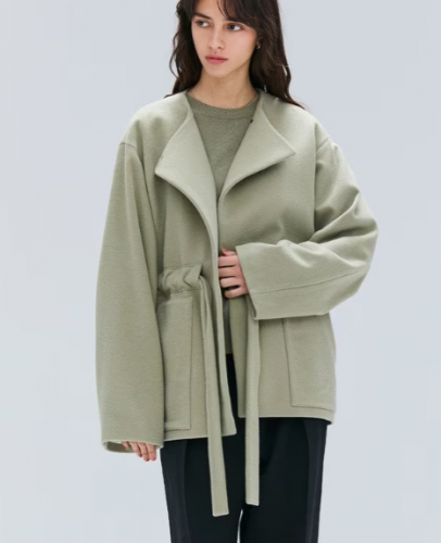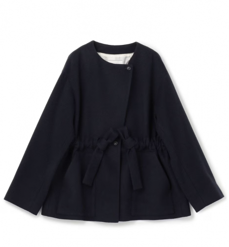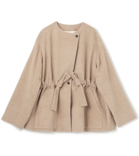 様々な着こなしが楽しめるショートコート。首元のボタンを上まで留めてノーカラーに、ウエストで留めてV開きに切り替わる、1枚で雰囲気が変わるデザイン。ボタンを留めずにさらりと羽織ればジャケットのように軽やかに、共布のリボンでウエストを絞れば腰回りをすっきりとメリハリのあるスタイルが完成します。柔らかなトープとライトカーキ、ネイビーの3色展開で、腰にかかる程よい着丈がカジュアルなワイドパンツやきれいめなタイトスカートとも合わせやすく、初秋からロングシーズン楽しめるコートです。