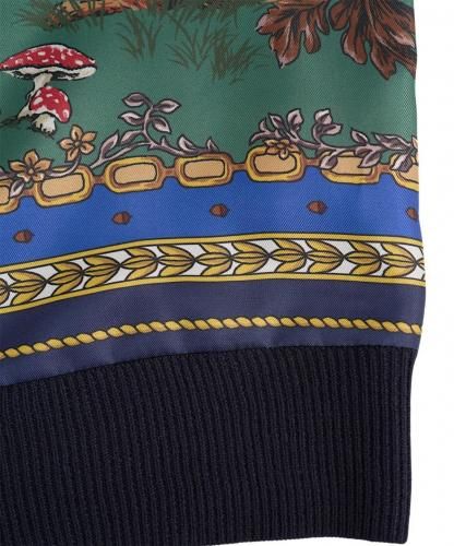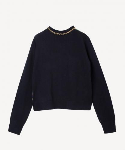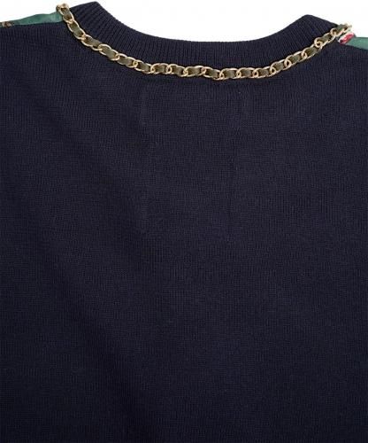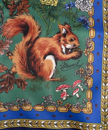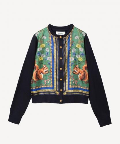 リスが描かれたオリジナルスカーフプリントをドッキングしたカーディガン。襟元にリボンを通したチェーンを縫い付けて華やかさを添えました。ゴールドボタンがポイント。