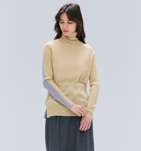 BEIGE,人気ニットシリーズから、シーズンカラーをあしらったタートルネックが新登場。前後のカラーブロックがメリハリを与える主役級デザイン。程よくフィットするタートルネックは、折り返さずに自然なたるみを持たせるのがおすすめ。裾に施されたスリットでこなれ感を演出し、ボトムを選ばず合わせやすい着丈も魅力。ジャケットやコートのインナーとしてはもちろん、オフィスやお仕事、普段のカジュアル着として、幅広いシーンで着回せる万能ニットです。
